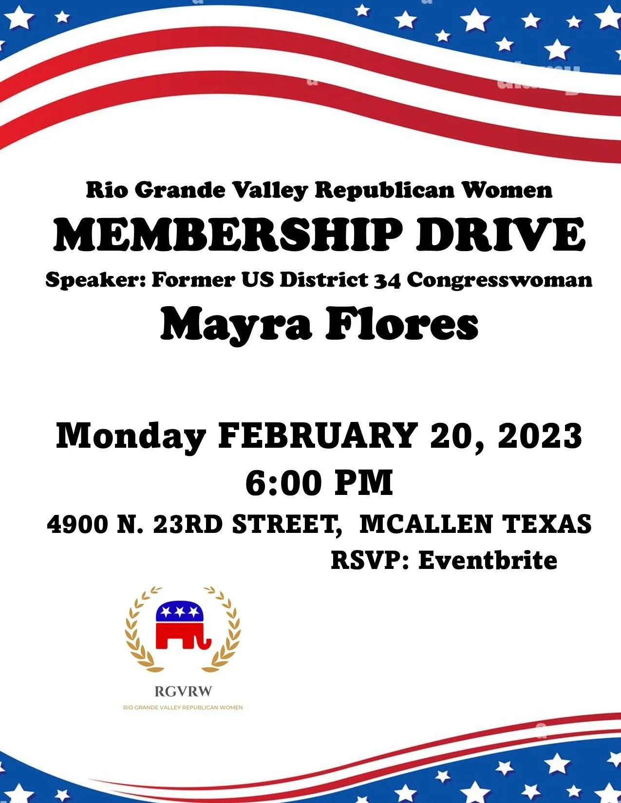 Join us for our annual Membership Drive and welcome our guest speaker, Former U.S. District 34 Congresswoman Mayra Flores. Open to the public. For media inquiries please email RGVRepublicanWomenTX@gmail.com.